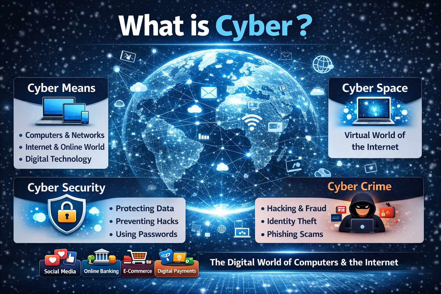 In simple terms, Cyber is the digital world where computers, networks, and internet technologies connect people and information globally.